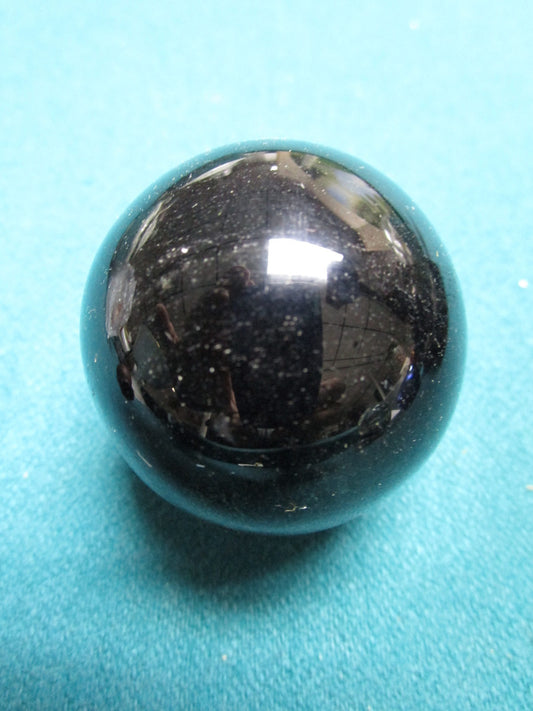 Black Glass studio paperweight on wood base, 1 1/2" diam ```