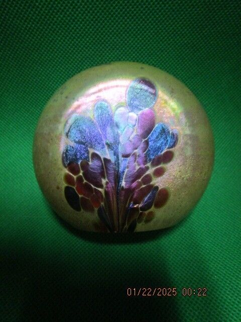 Paperweight Iridescent Flowers Signed 3 X 3 1/2" [PPWC]