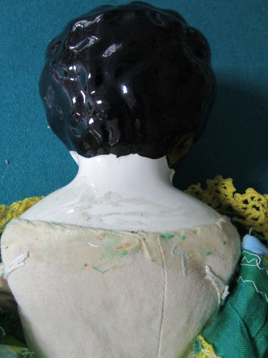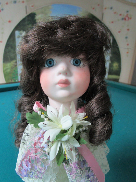 BEAUTIFUL doll girl HEAD LONG BLACK HAIR AND FLOWERS 11" WOOD STAND a beauty