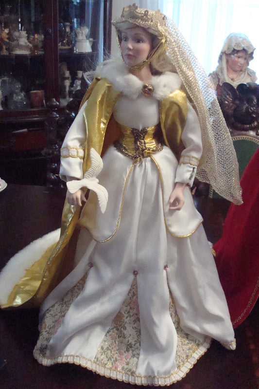 1980sDanbury Mint Queen Guinevere and King Arthur dolls, 19" tall stand ORIGINAL