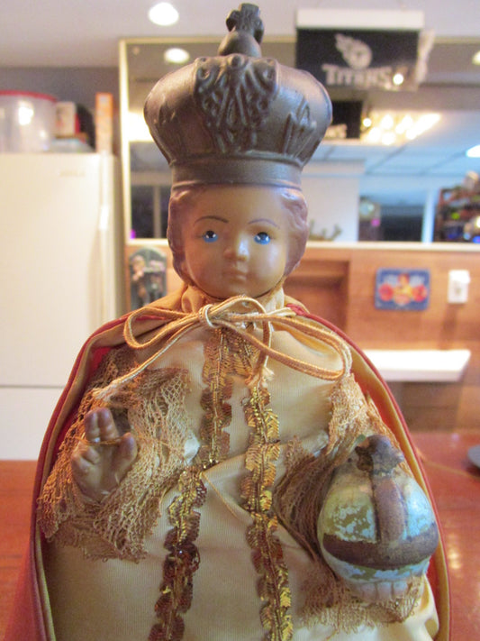 Mid Century Infant of Prague Jesus Christ chalkware statue, 12"l dressed[a*12]