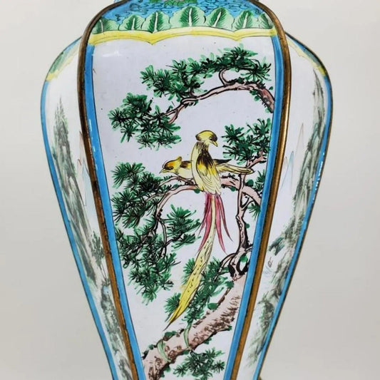 Vintage Chinese Enameled Metal Lamp on Original Wood Base