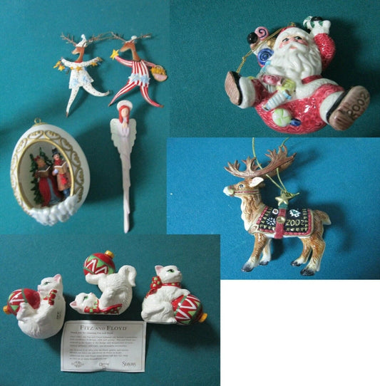 CHRISTMAS HOLIDAY ORNAMENTS TIN EGG FITZ & FLOYD REINDEER SANTA KITTIES ^^