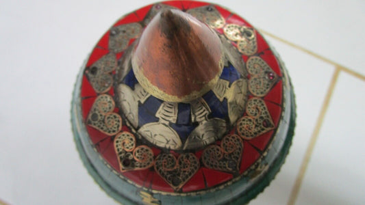 Antique Tibetan Buddhist Brass Inlay Turquoise Prayer Wheel 10" H