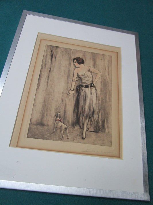 ORIGINAL SIGNED ETCHING BELLE EPOQUE LADY WITH A DOG ILLEGIBLE SIGNATURE