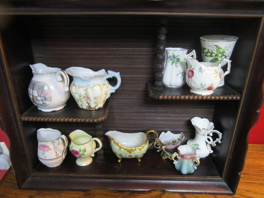 COLLECTION OF CERAMIC CREAMERS IN WOODEN VINTAGE RACK lot 13pcs and rack
