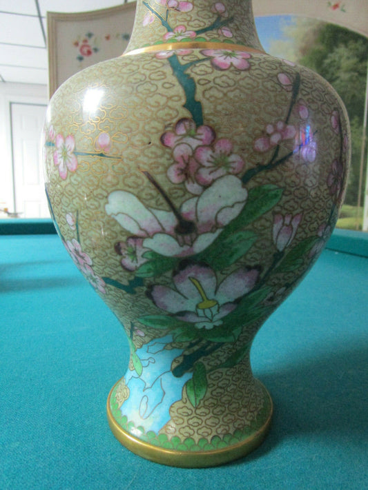 Chinese cloisonne vase gold and pink flowers, turquoise base, metal inside [*a4]