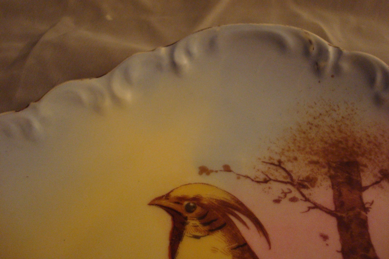 Old German plate decorated with birdsm, molded and ruffled borders, gold guild